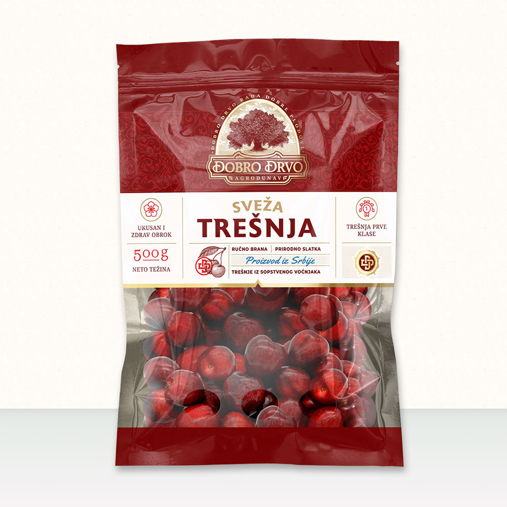 Naša sveža trešnja je trešnja premijum kvaliteta. Svaki plod prolazi strogu kontrolu kako bi samo zdravi i zreli plodovi došli do naših kupaca. Uslovi u kojima se sveža trešnja skladišti su strogo kontrolisani. Raznolikost sorti u našem voćnjaku nam omogućava da na tržištu imamo svežu, kvalitetnu trešnju duži period od uobičajenog.